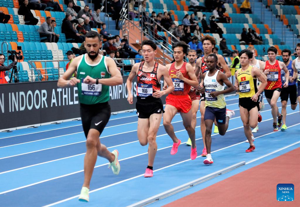 Wang Fudong (2nd L) of China competes during the men's 3000m final at the 10th Asian Indoor Athletics Championships in Astana, Kazakhstan, Feb. 12, 2023. (Photo by Kalizhan Ospanov/Xinhua)