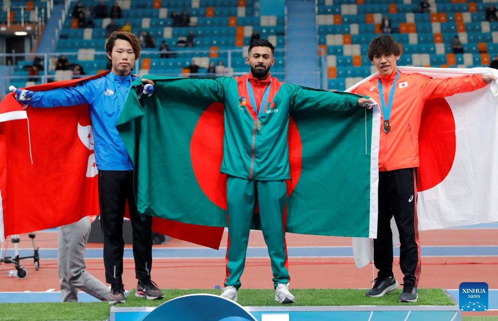 (from L to R) Silver medalist Shak Kam Ching of China's Hong Kong, gold medalist Imranur Rahman of Bangladesh and bronze medalist Suzuki Ryota of Japan pose during the awarding ceremony of the men's 60M event at the 10th Asian Indoor Athletics Championships in Astana, Kazakhstan, Feb. 12, 2023. (Photo by Kalizhan Ospanov/Xinhua)