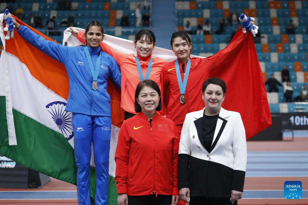 (from L ro R, top) Jyothi Yarraji of India, Aoki Masumi of Japan and Chen Jiamin of China pose during the awarding ceremony after the women's 60M hurdles final at the 10th Asian Indoor Athletics Championships in Astana, Kazakhstan, Feb. 12, 2023. (Photo by Kalizhan Ospanov/Xinhua)
