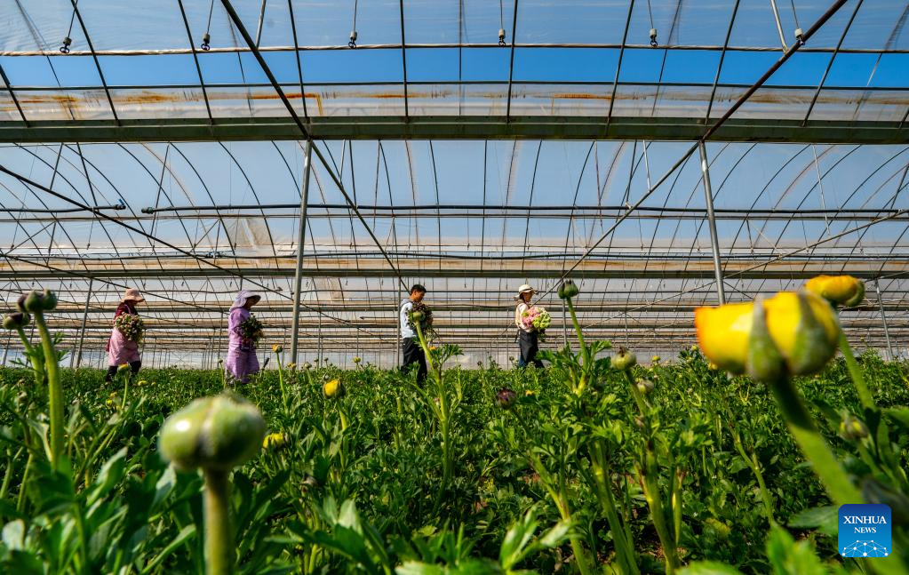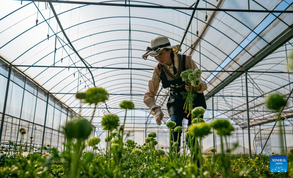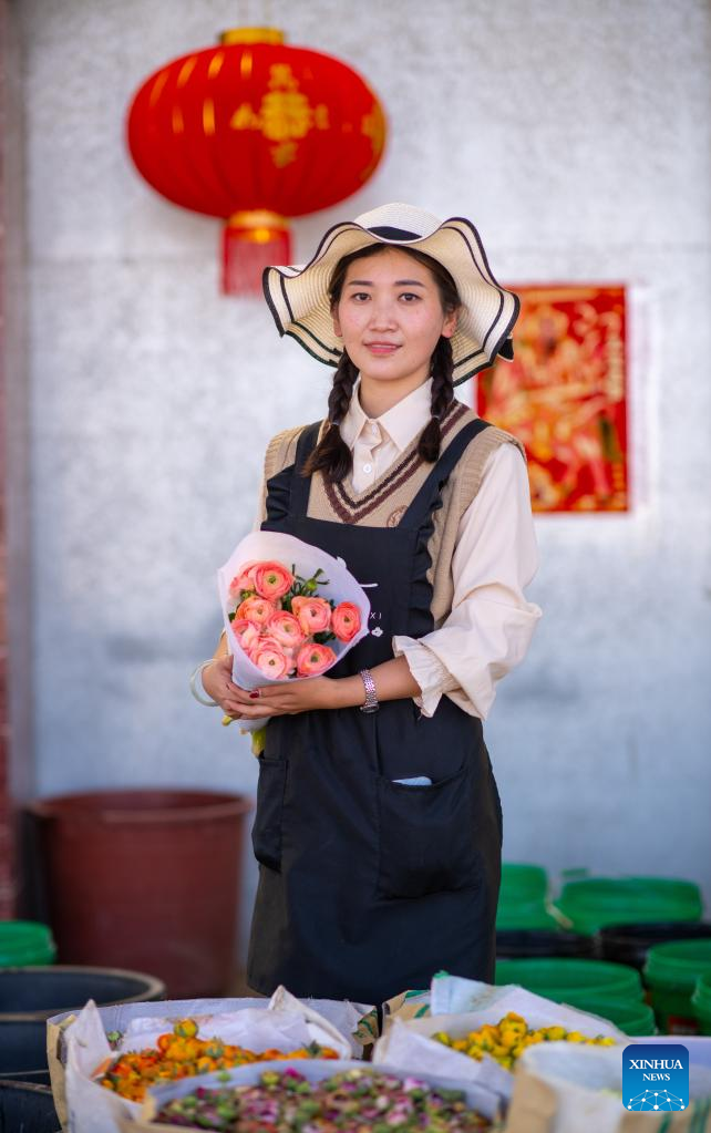 Bi Xixi picks fresh flowers at her own flower field in Qujing, southwest China's Yunnan Province, Feb. 12, 2023.