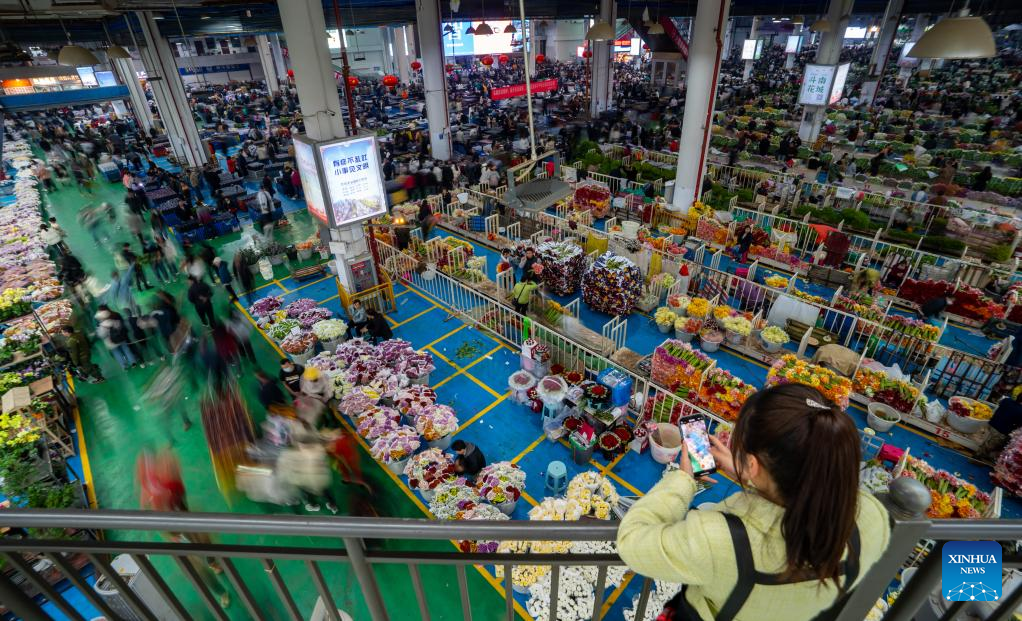 Bi Xixi selects flowers at Dounan Flower Market in Kunming, southwest China's Yunnan Province, Feb. 13, 2023.