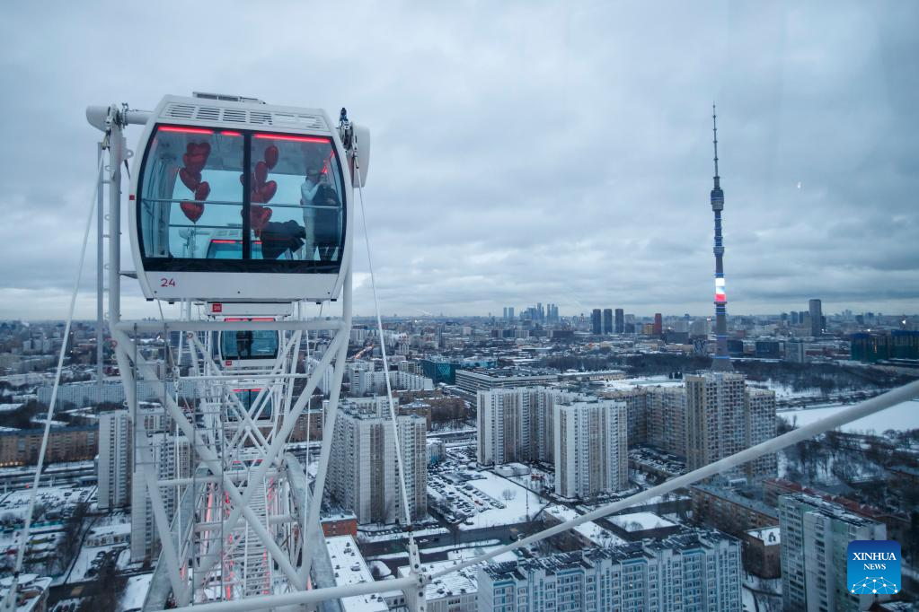 A couple celebrates Valentine's Day in a cabin of a ferris wheel in Moscow, Russia, on Feb. 14, 2023. (Photo by Alexander Zemlianichenko Jr/Xinhua)