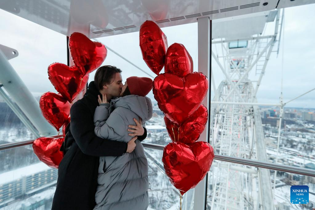 A couple celebrates Valentine's day in a cabin of a ferris wheel in Moscow, Russia, on Feb. 14, 2023. (Photo by Alexander Zemlianichenko Jr/Xinhua)