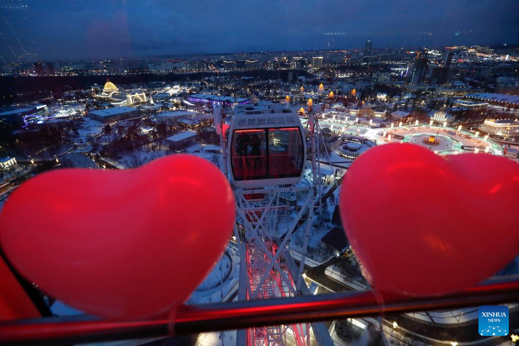 Heart-shaped decorations are installed to celebrate Valentine's Day on a ferris wheel in Moscow, Russia, on Feb. 14, 2023. (Photo by Alexander Zemlianichenko Jr/Xinhua)
