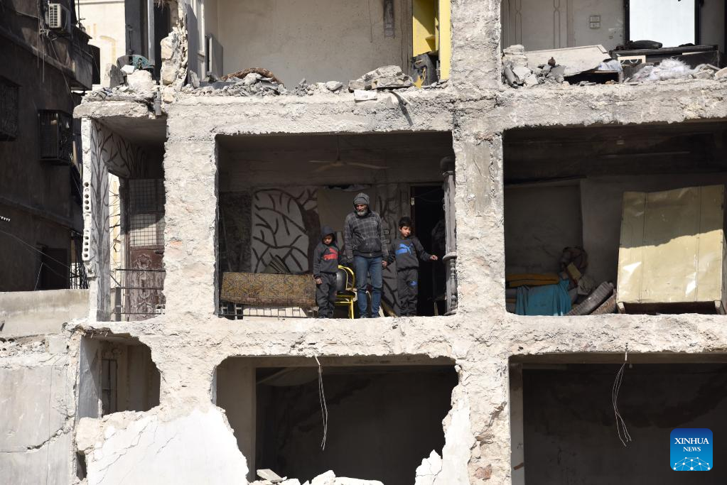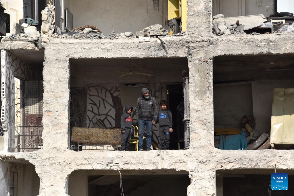 Ali Abdul-Rahman and his two kids stand on the side of his destroyed porch at his house in the Masharqa neighborhood in Aleppo city, northern Syria, Feb. 13, 2023. Piles of earthquake debris gave Ali Abdul-Rahman, a survivor in northern Syria, a harsh flashback to the near-death second when he escaped a crumbling wall at home, and how the wall shared by two buildings kept friends and neighbors part.(Photo by Monsef Memari/Xinhua)
