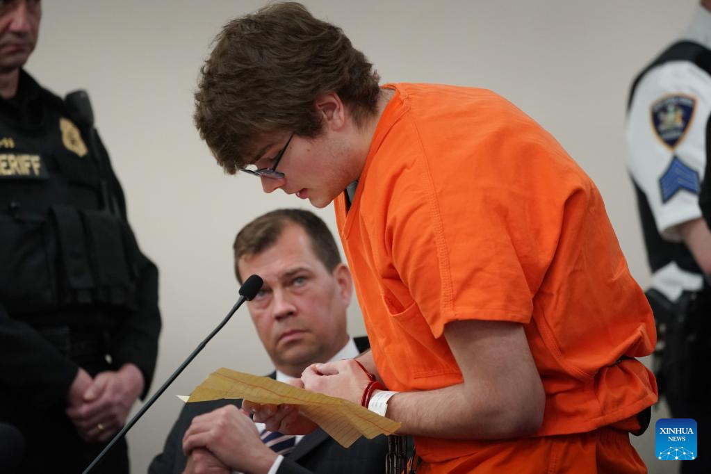Payton Gendron (Front) reads an apology to the court in Buffalo, New York State, the United States, on Feb. 15, 2023. The 19-year-old man Payton Gendron, who committed the mass shooting last May in Buffalo of the U.S. state of New York, was sentenced to life in prison without parole on Wednesday as expected while white supremacy got bashed at court. (Derek Gee/Buffalo News/Pool via Xinhua)