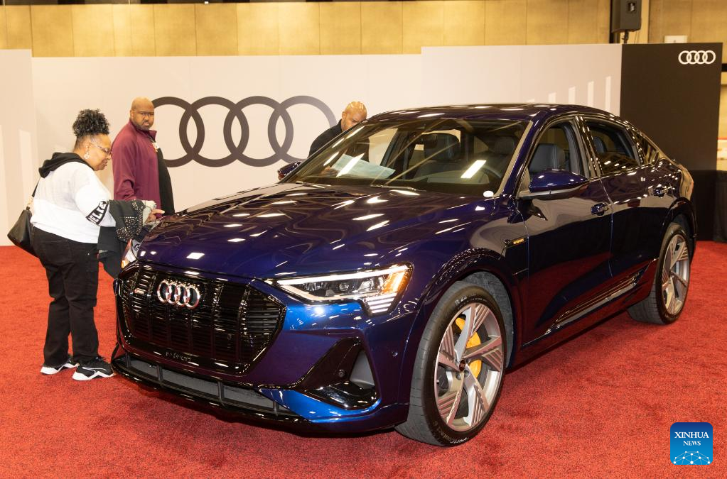 People look at an Audi EV at the North Texas Auto Show in Dallas, Texas, the United States, on Feb.16, 2023. The four-day North Texas Auto Show kicked off in Dallas on Thursday. (Photo by Dan Tian/Xinhua)