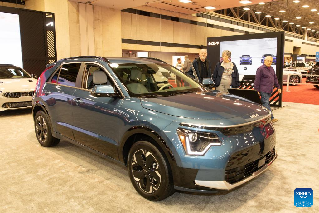 People look at a Kia EV at the North Texas Auto Show in Dallas, Texas, the United States, on Feb.16, 2023. The four-day North Texas Auto Show kicked off in Dallas on Thursday. (Photo by Dan Tian/Xinhua)