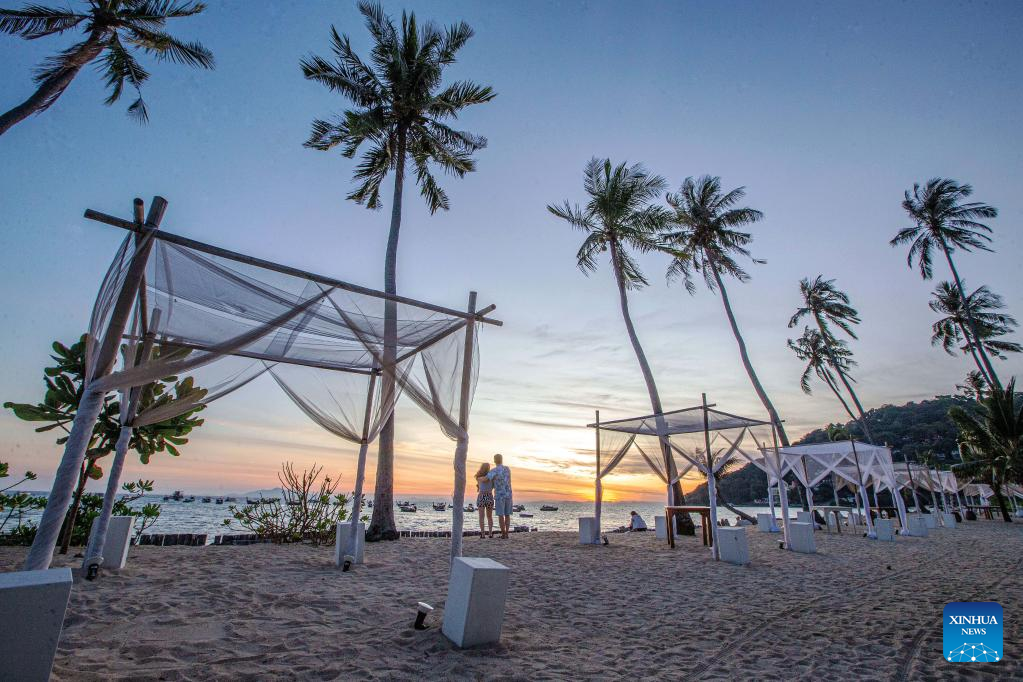 Tourists watch the sunrise at Phi Phi Islands national park in Krabi, Thailand, Feb. 16, 2023. Phi Phi Islands national park, with an area of about 388 square kilometers, attracts numerous tourists every year. (Xinhua/Wang Teng)