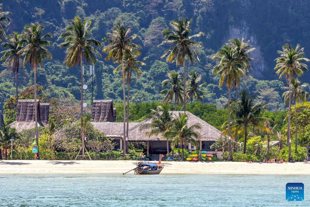 This photo taken on Feb. 16, 2023 shows a beach at Phi Phi Islands national park in Krabi, Thailand. Phi Phi Islands national park, with an area of about 388 square kilometers, attracts numerous tourists every year. (Xinhua/Wang Teng)