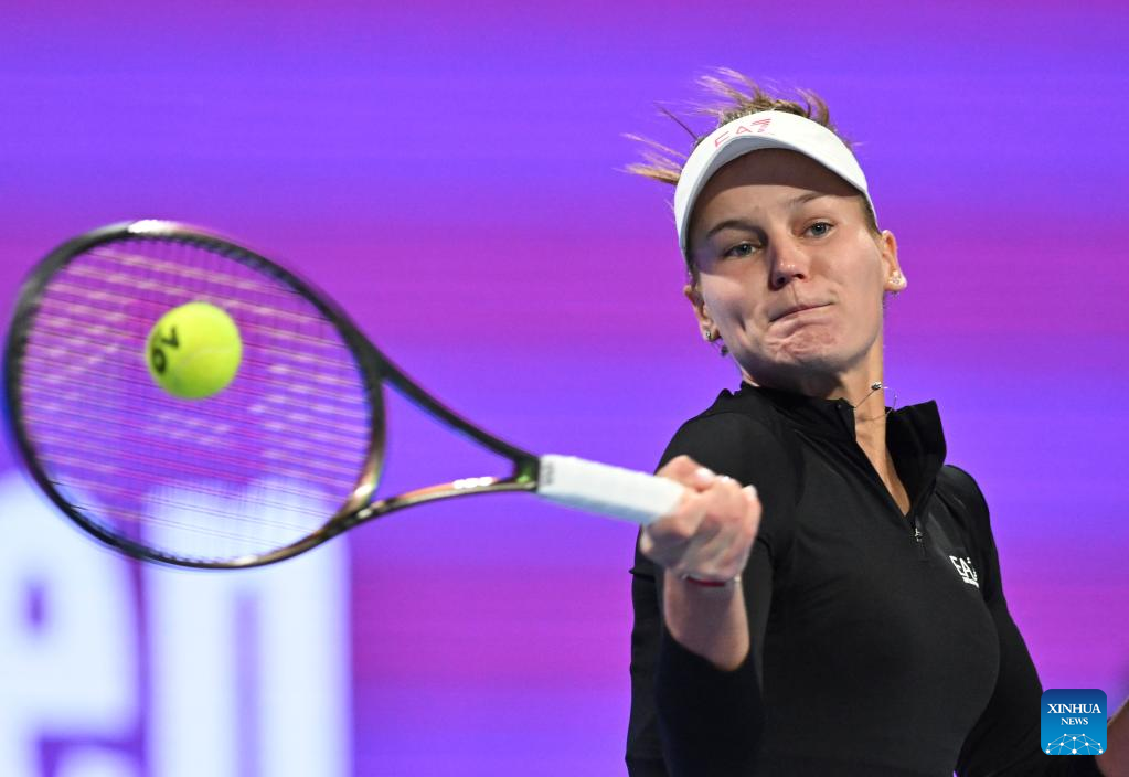 Veronika Kudermetova of Russia hits a return during the singles quarterfinal match against Coco Gauff of the United States at WTA500 Qatar Open 2023 in Doha, Qatar, Feb. 16, 2023. (Photo by Nikku/Xinhua)