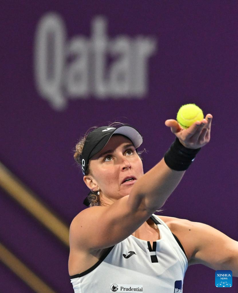 Veronika Kudermetova of Russia serves during the singles quarterfinal match against Coco Gauff of the United States at WTA500 Qatar Open 2023 in Doha, Qatar, Feb. 16, 2023. (Photo by Nikku/Xinhua)