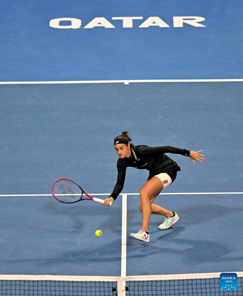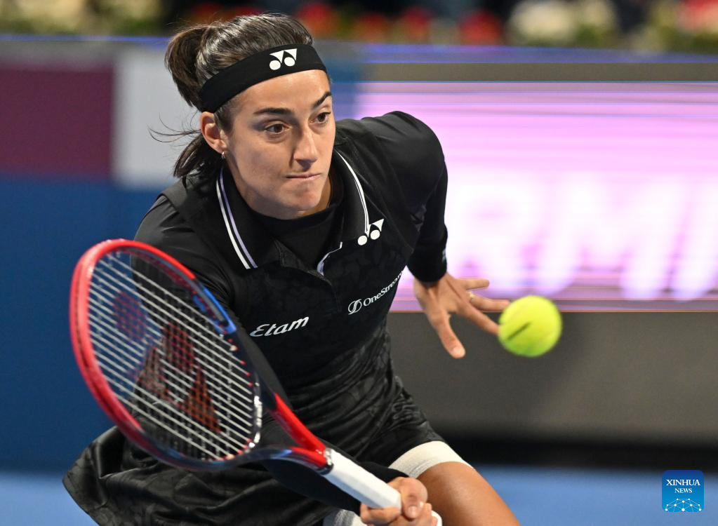 Caroline Garcia of France hits a return during the singles quarterfinal match against Maria Sakkari of Greece at WTA500 Qatar Open 2023 in Doha, Qatar, Feb. 16, 2023. (Photo by Nikku/Xinhua)