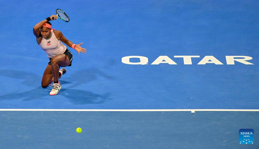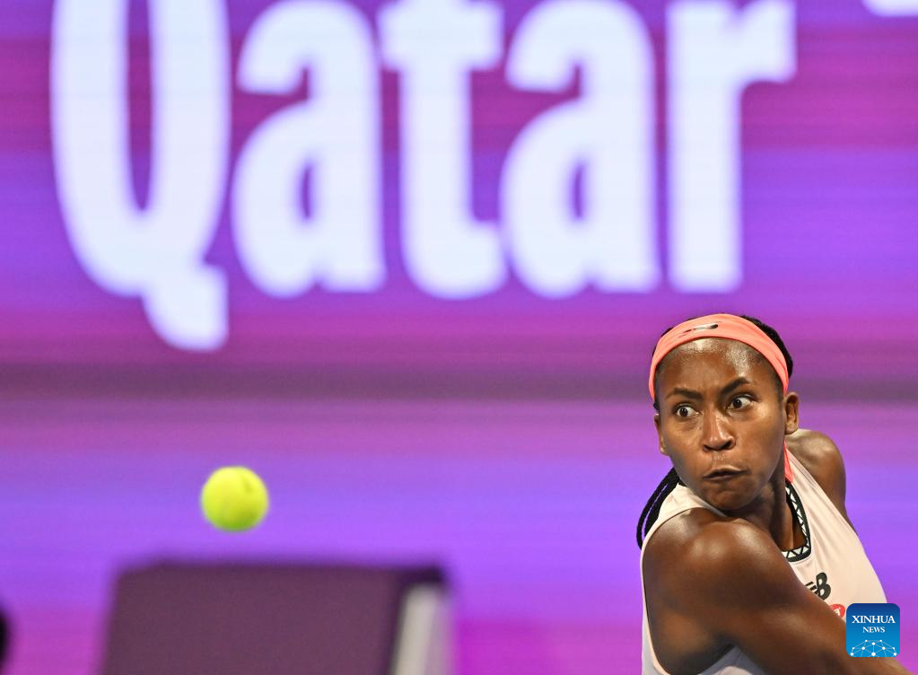 Coco Gauff of the United States hits a return during the singles quarterfinal match against Veronika Kudermetova of Russia at WTA500 Qatar Open 2023 in Doha, Qatar, Feb. 16, 2023. (Photo by Nikku/Xinhua)