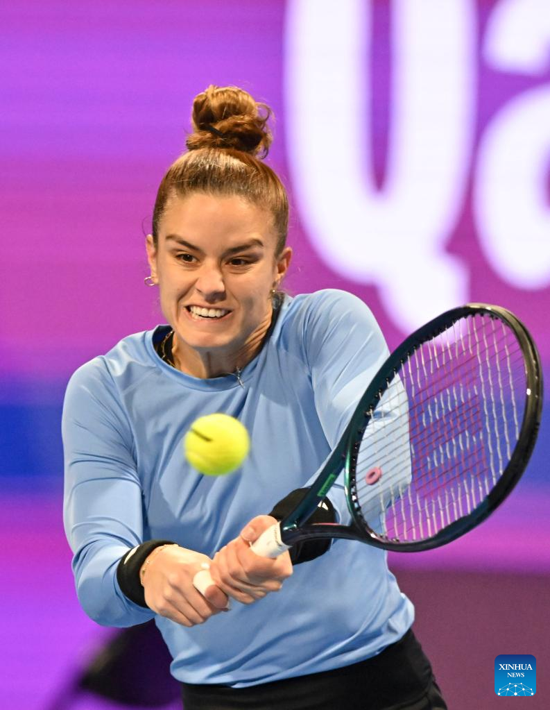 Maria Sakkari of Greece hits a return during the singles quarterfinal match against Caroline Garcia of France at WTA500 Qatar Open 2023 in Doha, Qatar, Feb. 16, 2023. (Photo by Nikku/Xinhua)