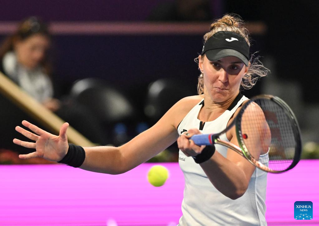 Beatriz Haddad Maia of Brazil hits a return during the singles quarterfinal match against Jessica Pegula of the United States at WTA500 Qatar Open 2023 in Doha, Qatar, Feb. 16, 2023. (Photo by Nikku/Xinhua)