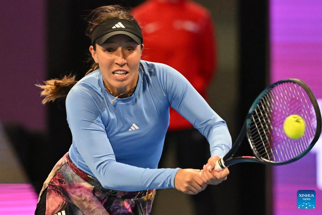 Jessica Pegula of the United States hits a return during the singles quarterfinal match against Beatriz Haddad Maia of Brazil at WTA500 Qatar Open 2023 in Doha, Qatar, Feb. 16, 2023. (Photo by Nikku/Xinhua)