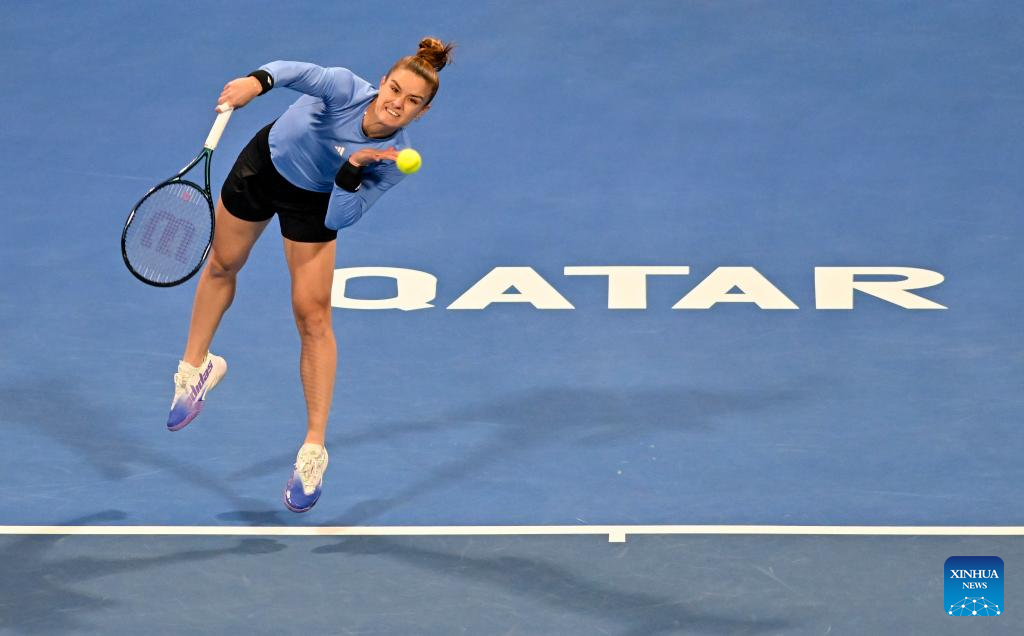Maria Sakkari of Greece serves during the singles quarterfinal match against Caroline Garcia of France at WTA500 Qatar Open 2023 in Doha, Qatar, Feb. 16, 2023. (Photo by Nikku/Xinhua)