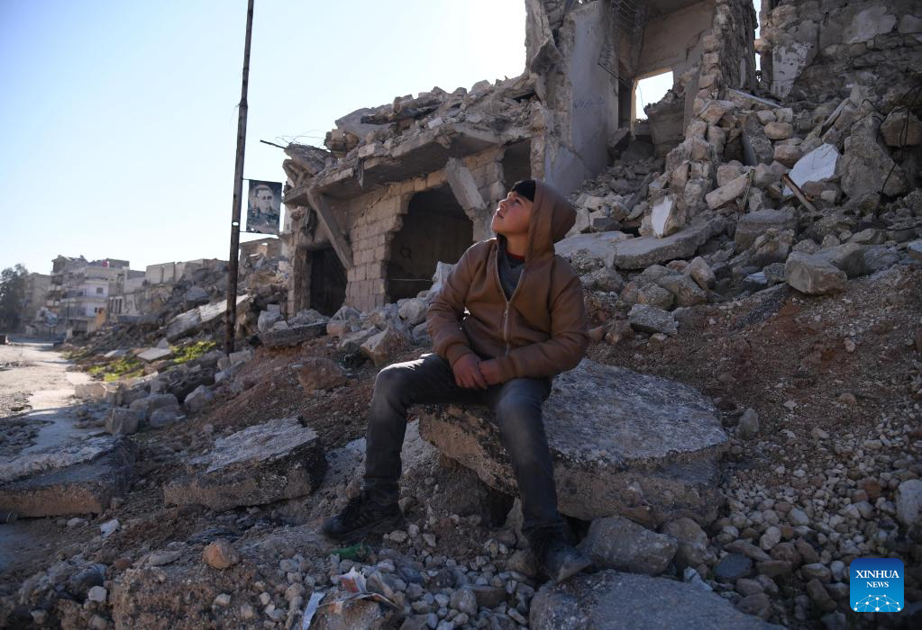 A displaced boy sits among the rubble of a shattered building in Aleppo, Syria, on Feb. 17, 2023. (Str/Xinhua)