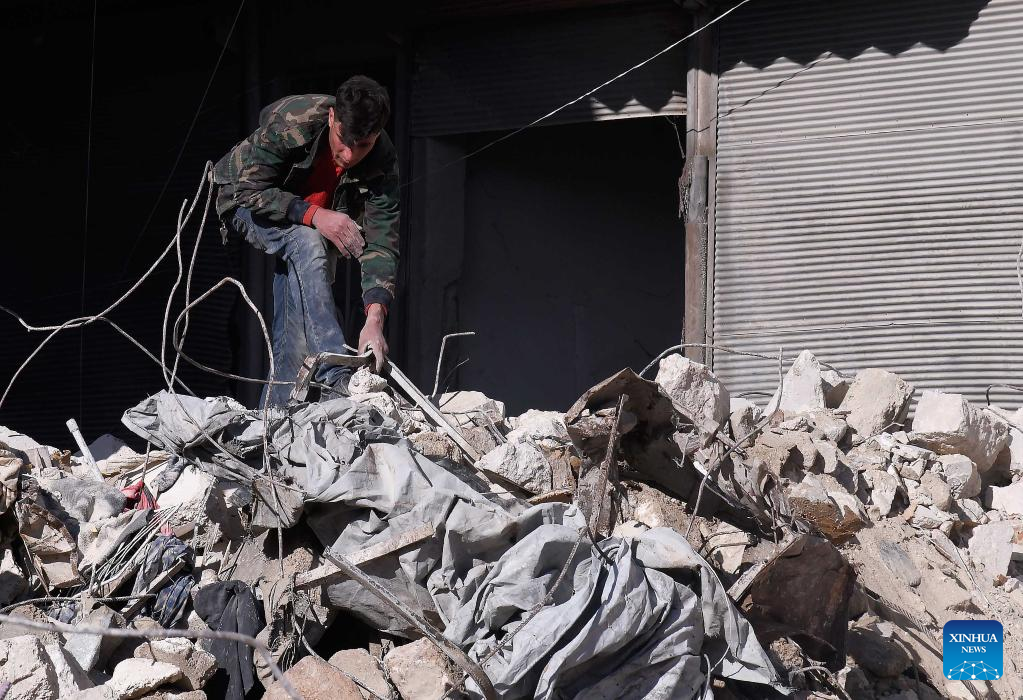 A displaced man collects belongings among the rubble of a shattered building in Aleppo, Syria, on Feb. 17, 2023. (Str/Xinhua)