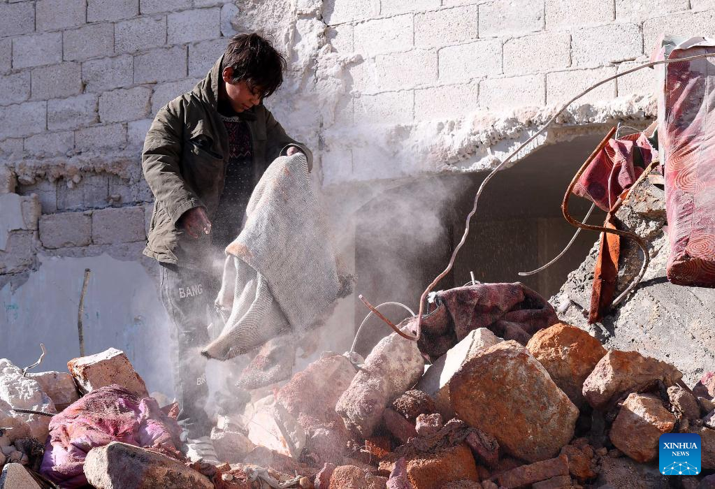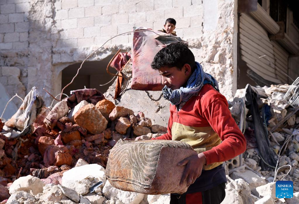 A displaced boy collects belongings among the rubble of a shattered building in Aleppo, Syria, on Feb. 17, 2023. (Str/Xinhua)