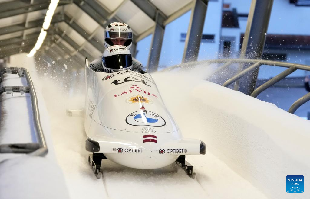 Emils Cipulis (front) and Matiss Miknis of Latvia compete during their first run of the 2-man bobsleigh competition at the IBSF World Cup in Sigulda, Latvia, Feb. 18, 2023. (Photo by Edijs Palens/Xinhua)