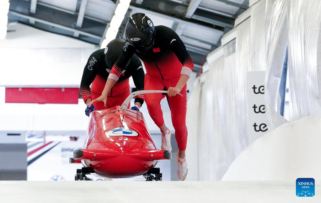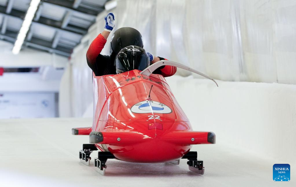 Li Chunjian (R) and Ye Jielong of China competes during their first run of the 2-man bobsleigh competition at the IBSF World Cup in Sigulda, Latvia, Feb. 18, 2023. (Photo by Edijs Palens/Xinhua)