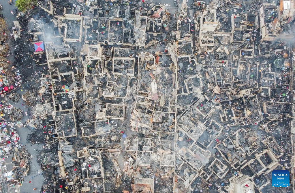 This aerial photo taken on Feb. 19, 2023 shows the charred houses after a fire at a residential area in Quezon City, the Philippines.