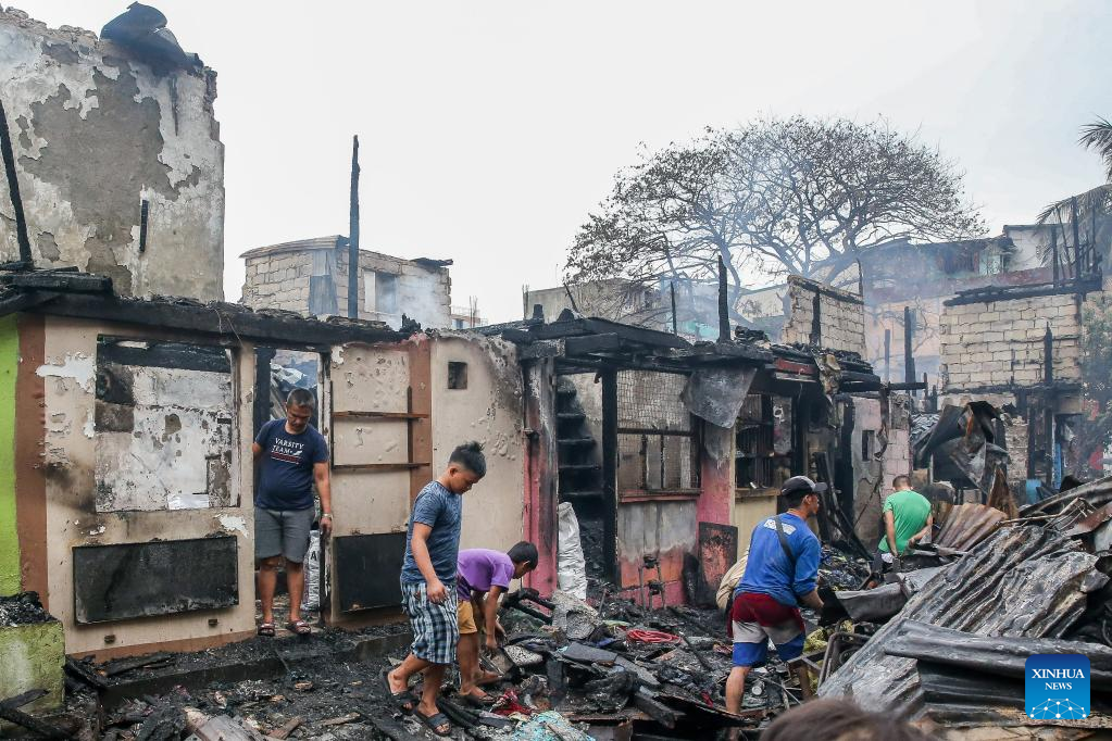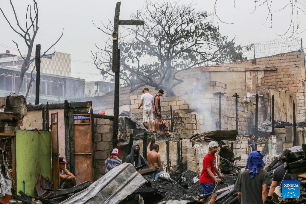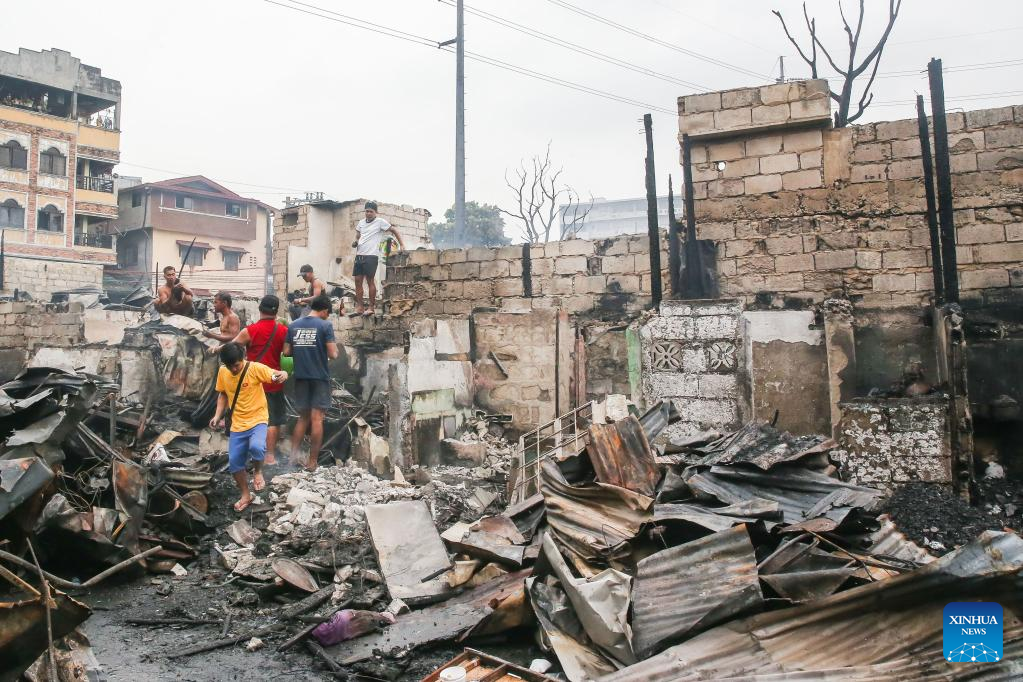 Residents are seen on the rubbles of their homes after a fire at a residential area in Quezon City, the Philippines, Feb. 19, 2023.