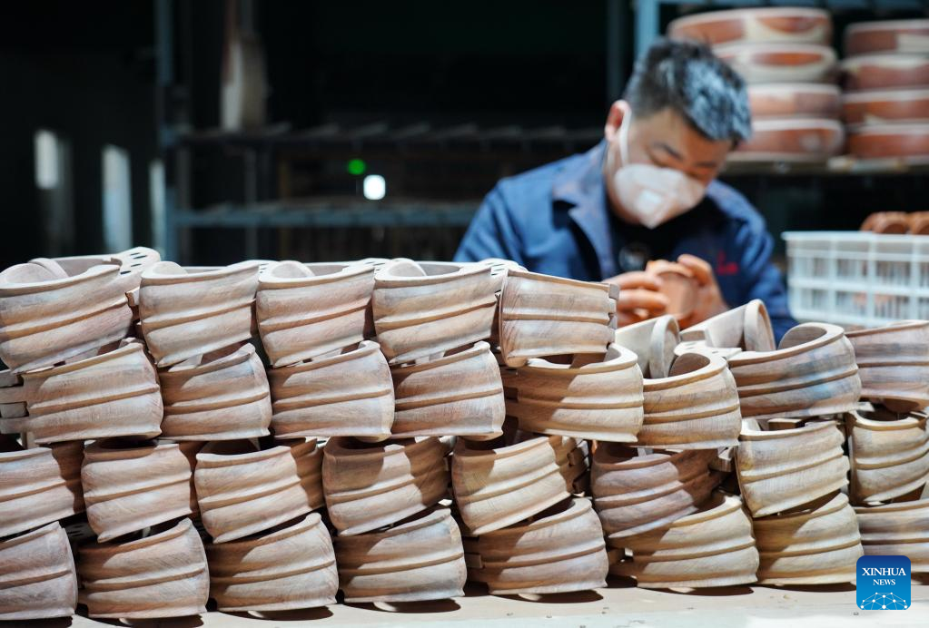A worker makes a traditional Chinese musical instrument at a workshop in Suning County, north China's Hebei Province, Feb. 18, 2023.