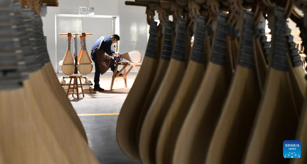 A worker puts traditional Chinese musical instruments in place at a workshop in Suning County, north China's Hebei Province, Feb. 18, 2023.