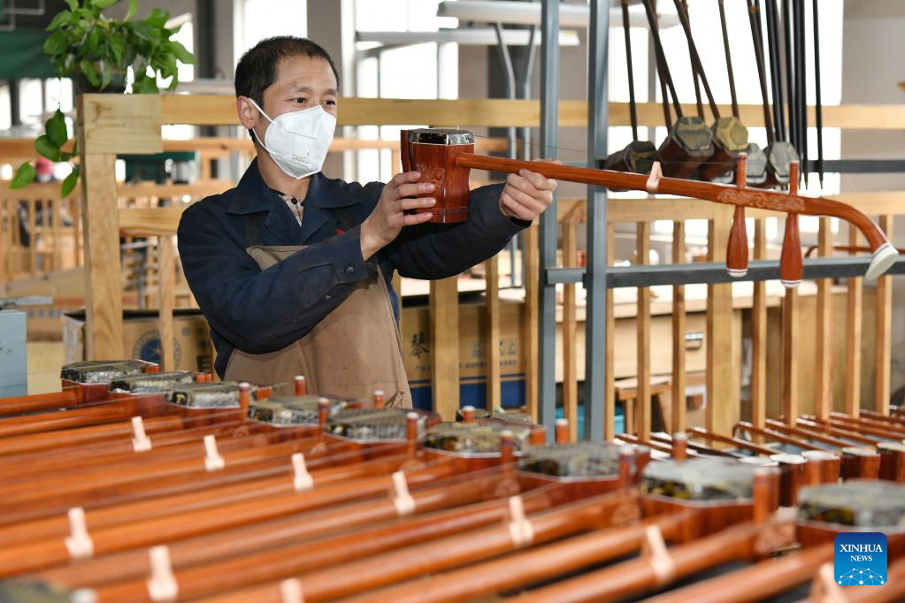 A worker tunes a traditional Chinese musical instrument at a workshop in Suning County, north China's Hebei Province, Feb. 18, 2023.