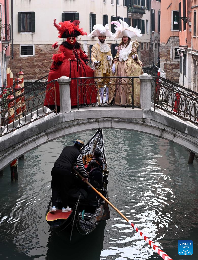 Revelers attend the Venice Carnival in Venice, Italy, Feb. 20, 2023. The Venice Carnival 2023 runs from Feb. 4 to Feb. 21 in the Italian lagoon city. (Photo by Alberto Lingria/Xinhua)