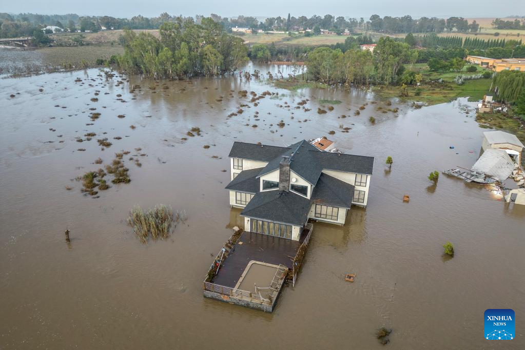 This photo taken on Feb. 19, 2023 shows flooded area in Parys, South Africa. The Vaal dam exceeded its maximum capacity due to heavy rainfall and caused floods in the Vaal River. (Photo by Shiraaz Mohamed/Xinhua)