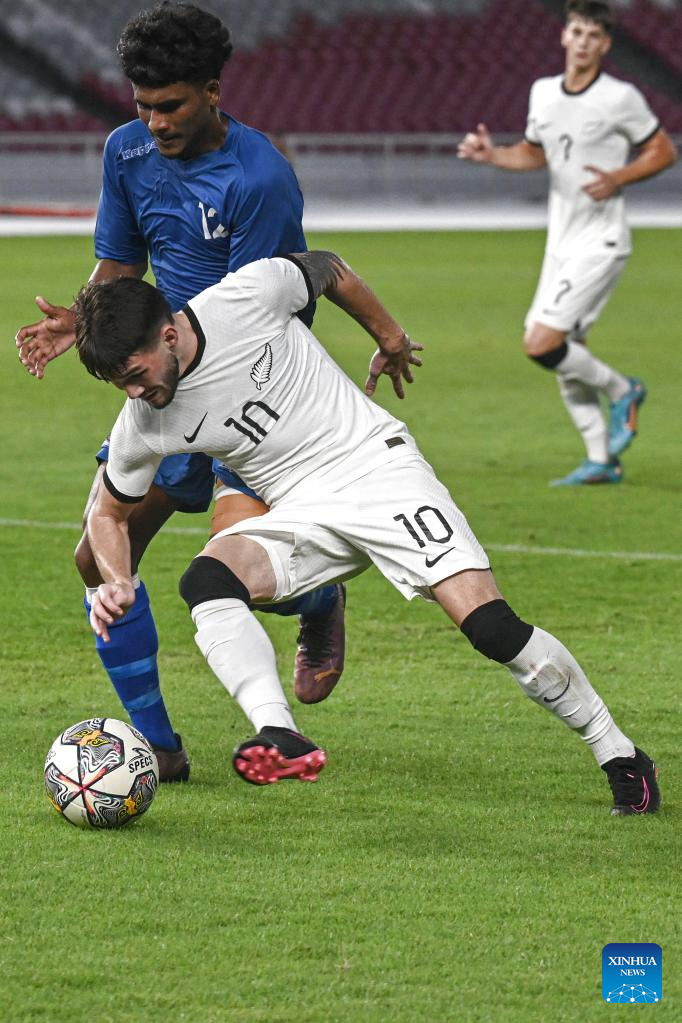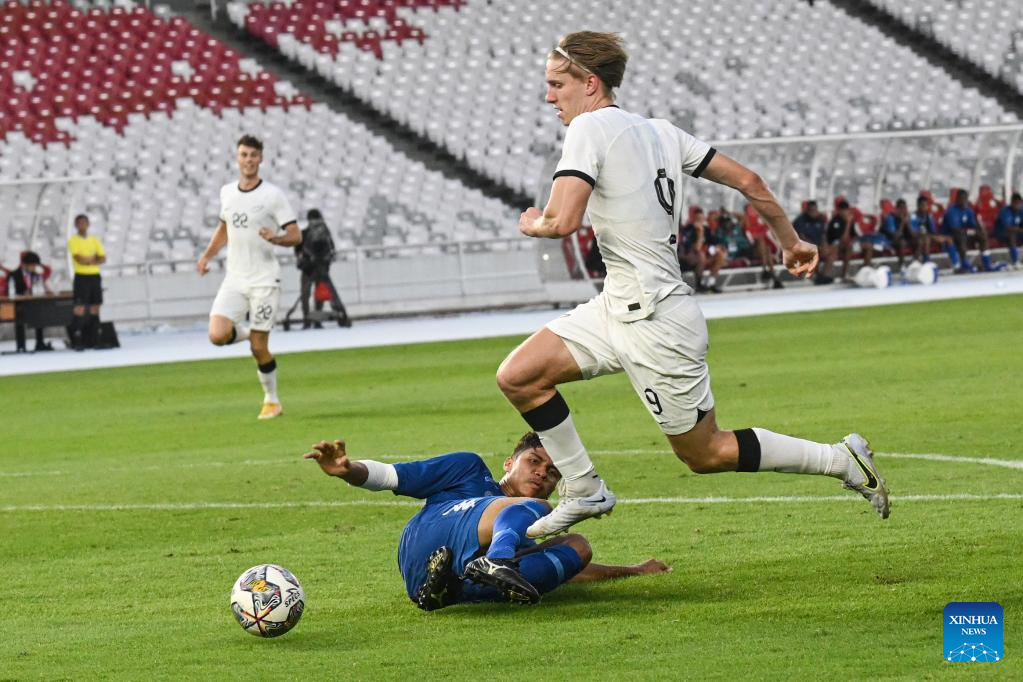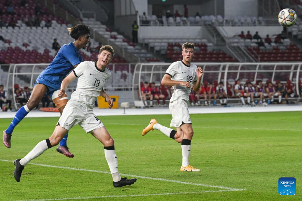 Lukas Eric Kelly-Heald (C) of New Zealand vies for the ball during the U20 international friendly match between New Zealand and Fiji at Gelora Bung Karno Stadium in Jakarta, Indonesia, Feb. 21, 2023. (Xinhua/Agung Kuncahya B.)