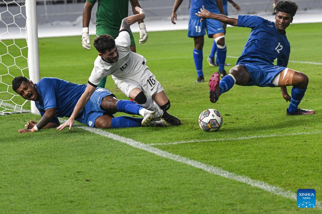 Jay Joshua Herdman (C) of New Zealand vies for the ball during the U20 international friendly match between New Zealand and Fiji at Gelora Bung Karno Stadium in Jakarta, Indonesia, Feb. 21, 2023. (Xinhua/Agung Kuncahya B.)