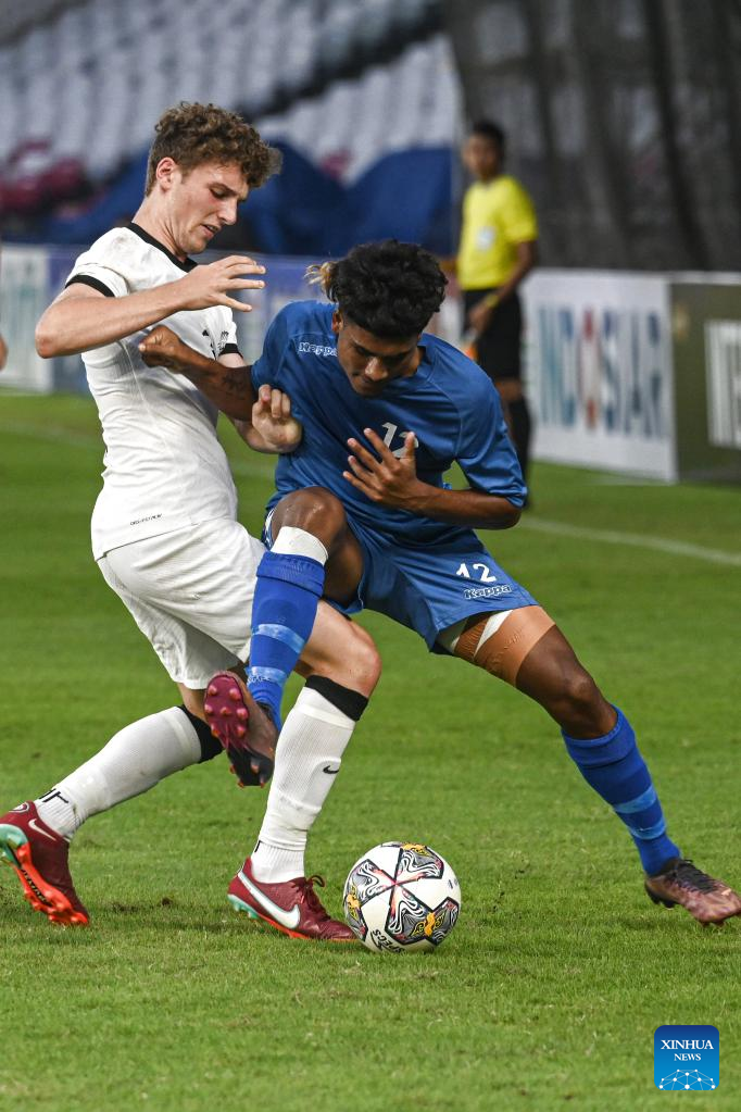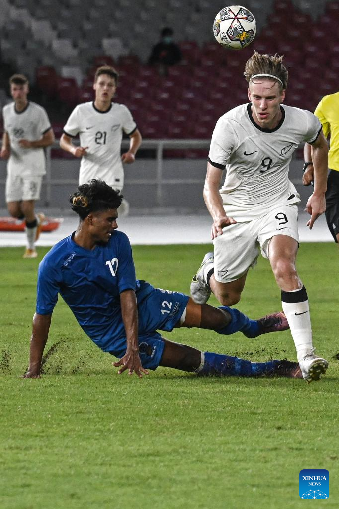 Mohammed Fataul Raheem (R) of Fiji vies for the ball during the U20 international friendly match between New Zealand and Fiji at Gelora Bung Karno Stadium in Jakarta, Indonesia, Feb. 21, 2023. (Xinhua/Agung Kuncahya B.)