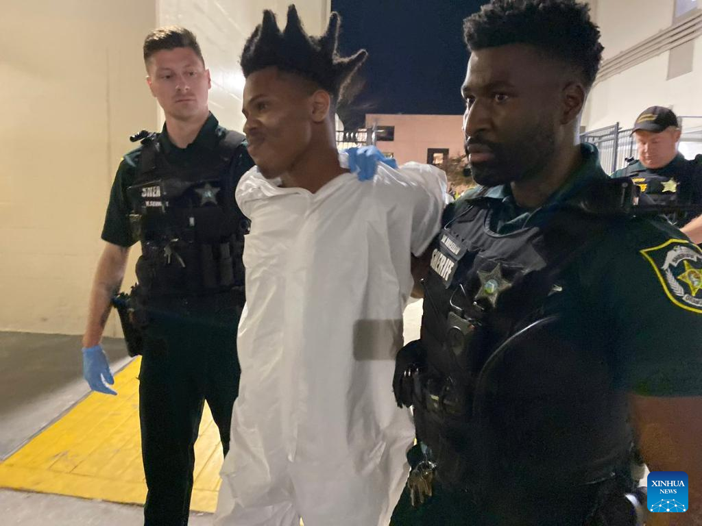 This image released by the Orange County Sheriff's Office shows the 19-year-old suspect Keith Melvin Moses (C) in Orange County, Florida, the United States, on Feb. 22, 2023. Police in Orange County, Florida, took into custody Wednesday night a suspect in a series of shootings that left three people dead. The victims are a woman in her 20s, a 9-year-old girl and a news company employee, according to the Orange County Sheriff's Office. The suspect, identified as 19-year-old Keith Melvin Moses, is said to have a lengthy criminal history. (Orange County Sheriff's Office/Handout via Xinhua)