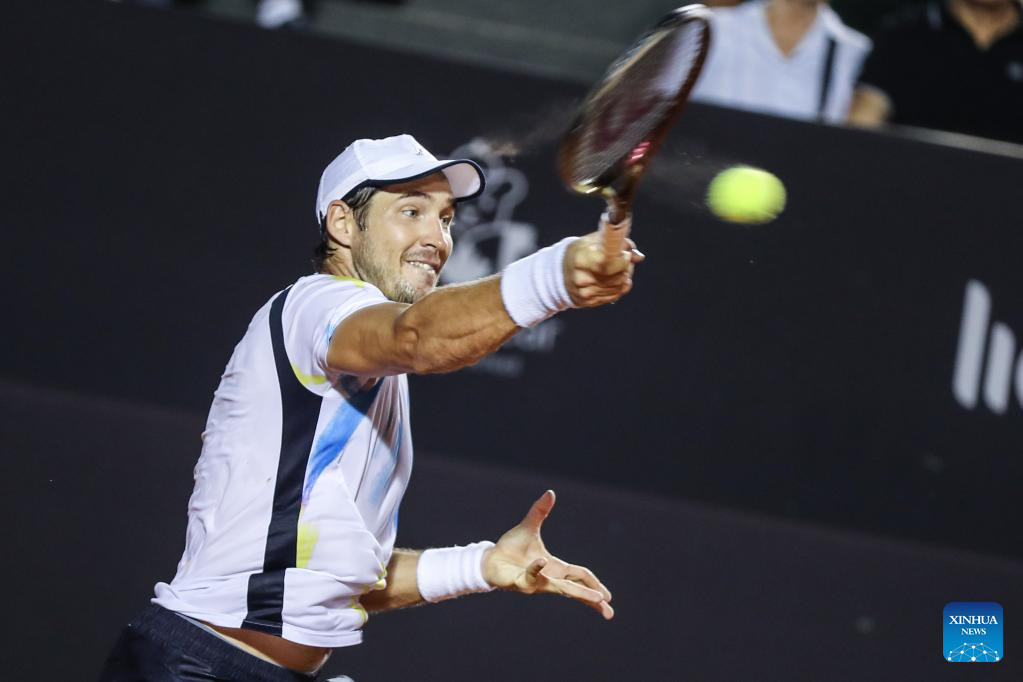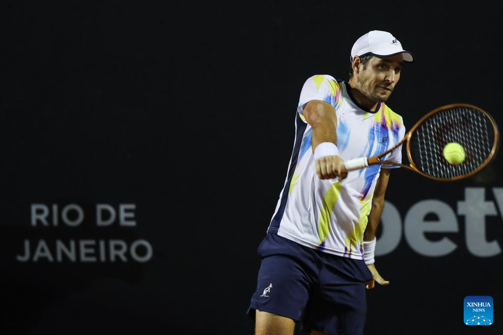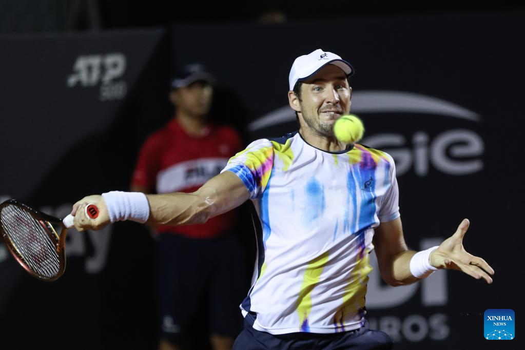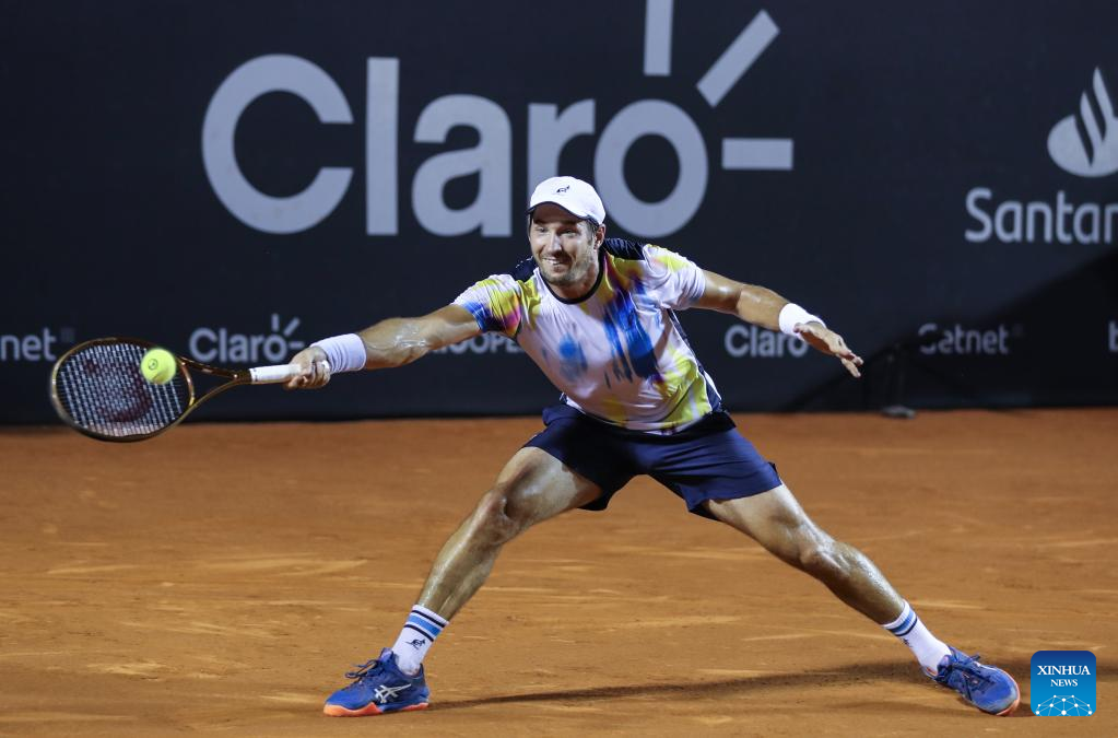 Dusan Lajovic of Serbia hits a return during the singles quarterfinal match against Carlos Alcaraz of Spain at the 2023 ATP500 Rio Open at Jockey Club Brasileiro in Rio de Janeiro, Brazil, Feb. 24, 2023. (Xinhua/Wang Tiancong)