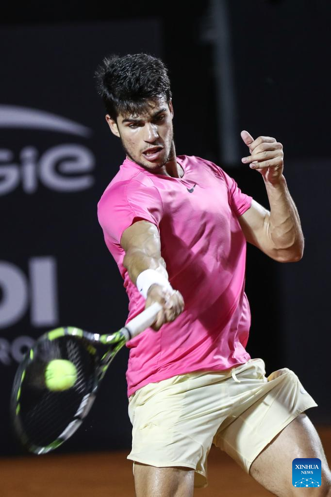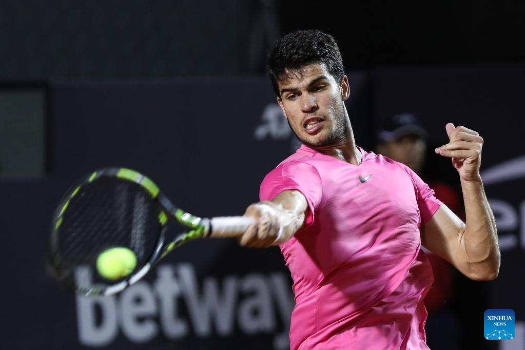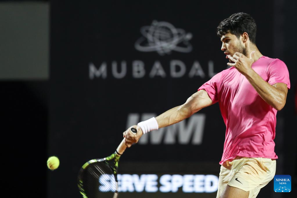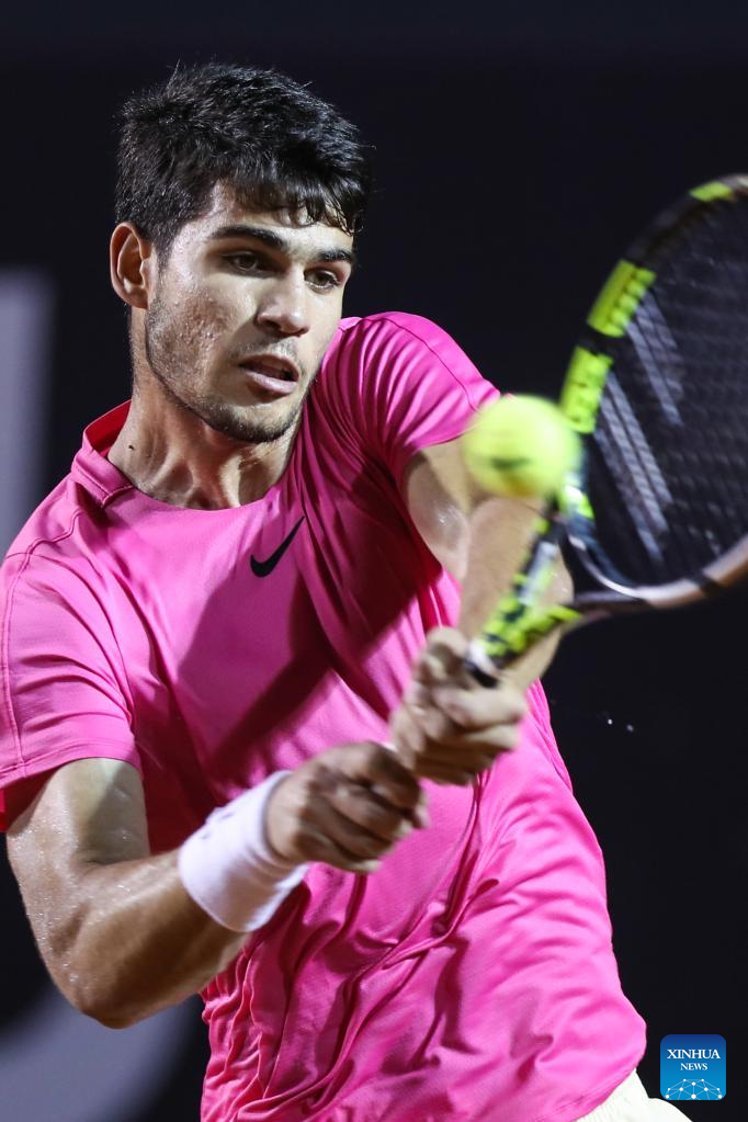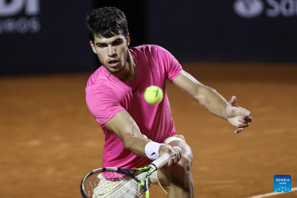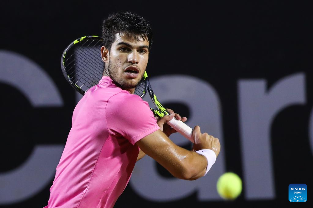 Carlos Alcaraz of Spain hits a return during the singles quarterfinal match against Dusan Lajovic of Serbia at the 2023 ATP500 Rio Open at Jockey Club Brasileiro in Rio de Janeiro, Brazil, Feb. 24, 2023. (Xinhua/Wang Tiancong)