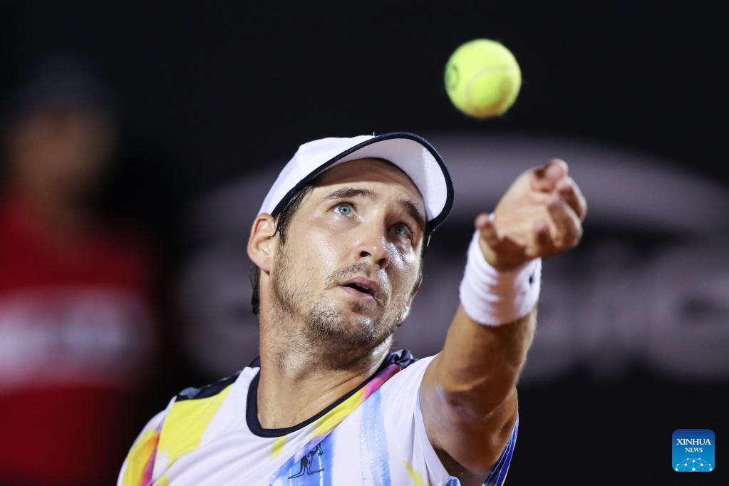 Dusan Lajovic of Serbia serves during the singles quarterfinal match against Carlos Alcaraz of Spain at the 2023 ATP500 Rio Open at Jockey Club Brasileiro in Rio de Janeiro, Brazil, Feb. 24, 2023. (Xinhua/Wang Tiancong)