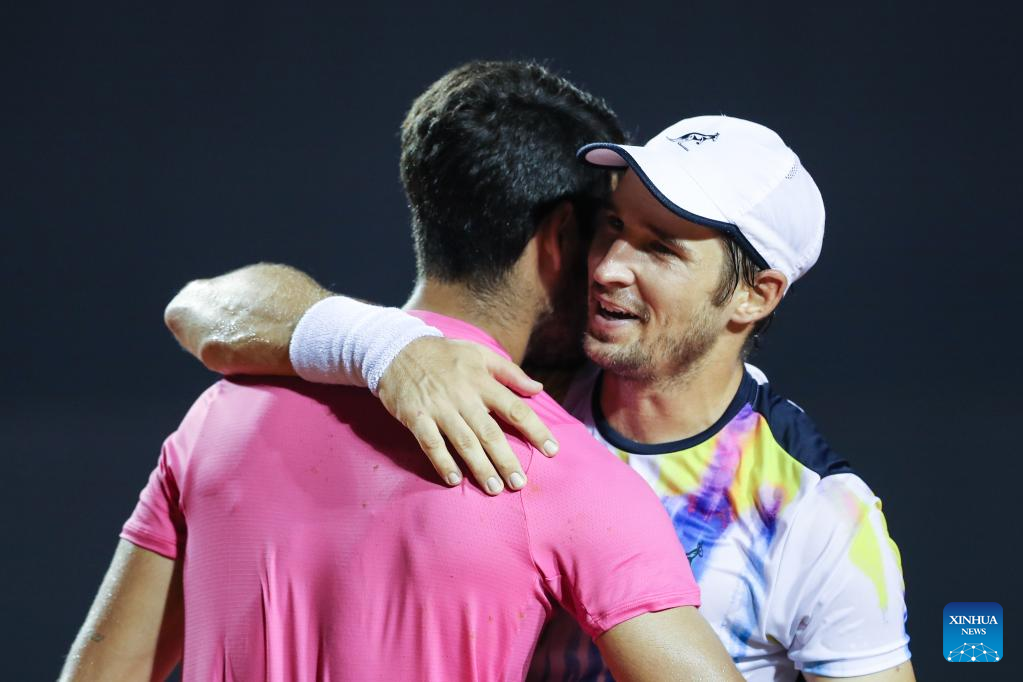 Dusan Lajovic of Serbia (R) hugs Carlos Alcaraz of Spain after their singles quarterfinal match at the 2023 ATP500 Rio Open at Jockey Club Brasileiro in Rio de Janeiro, Brazil, Feb. 24, 2023. (Xinhua/Wang Tiancong)