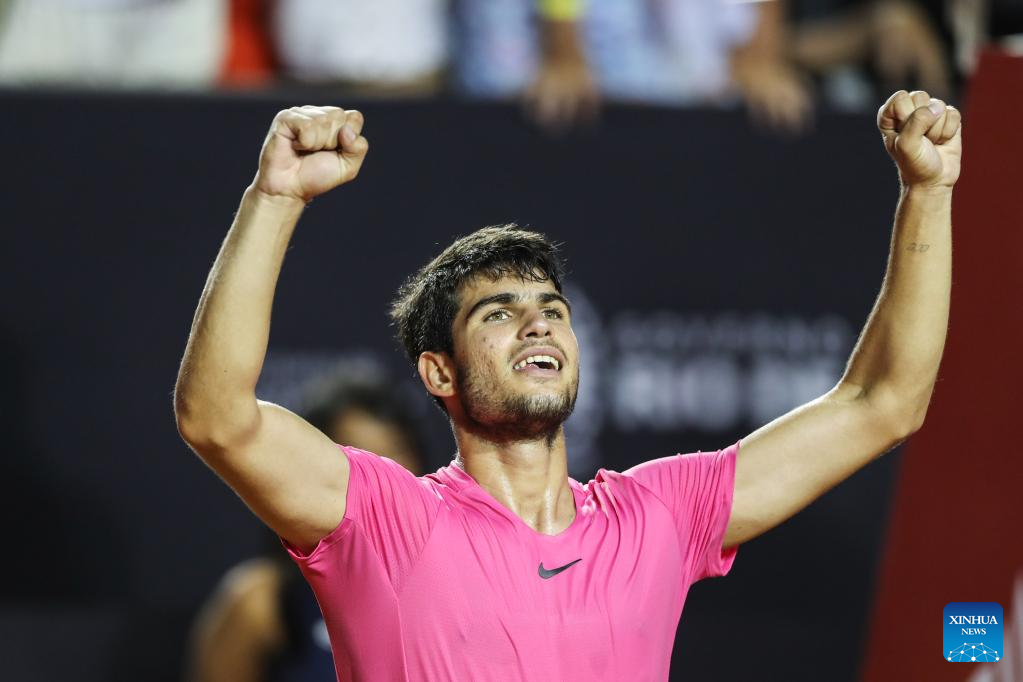 Carlos Alcaraz of Spain celebrates after winning the singles quarterfinal match against Dusan Lajovic of Serbia at the 2023 ATP500 Rio Open at Jockey Club Brasileiro in Rio de Janeiro, Brazil, Feb. 24, 2023. (Xinhua/Wang Tiancong)