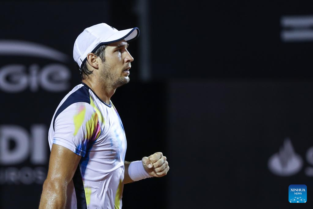 Dusan Lajovic of Serbia reacts during the singles quarterfinal match against Carlos Alcaraz of Spain at the 2023 ATP500 Rio Open at Jockey Club Brasileiro in Rio de Janeiro, Brazil, Feb. 24, 2023. (Xinhua/Wang Tiancong)