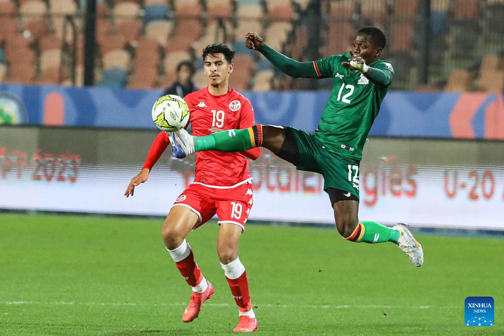 Mahmoud Ghorbel (L) of Tunisia competes with Peter Chikola of Zambia during the group C match at the 2023 CAF (Confederation of African Football) U-20 Africa Cup of Nations in Cairo, Egypt, Feb. 27, 2023. (Xinhua/Ahmed Gomaa)