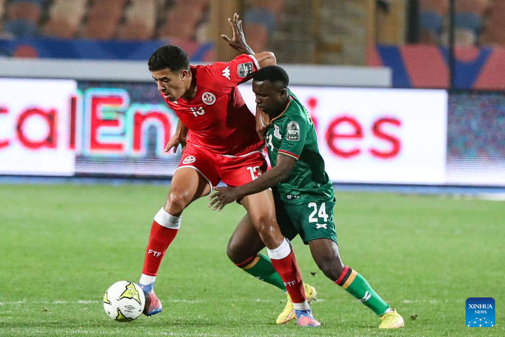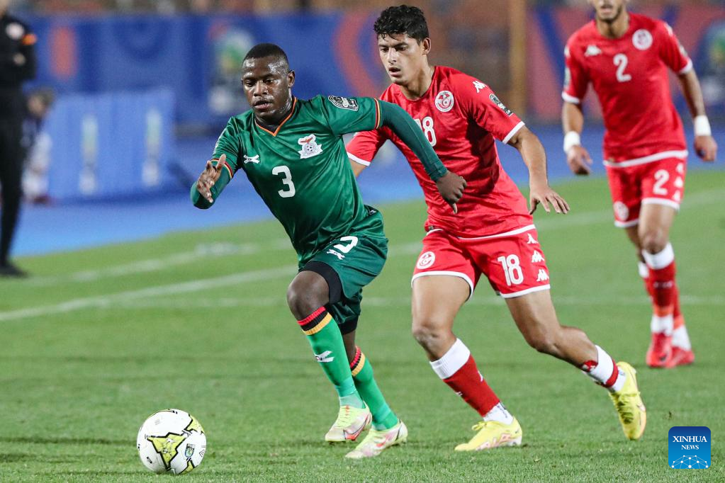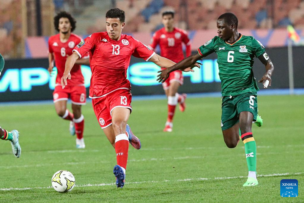 Kingstone Mutandwa (R) of Zambia competes during the group C match between Tunisia and Zambia at the 2023 CAF (Confederation of African Football) U-20 Africa Cup of Nations in Cairo, Egypt, Feb. 27, 2023. (Xinhua/Ahmed Gomaa)