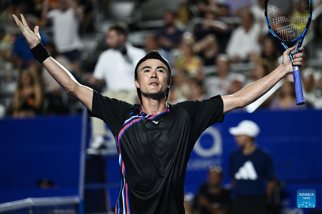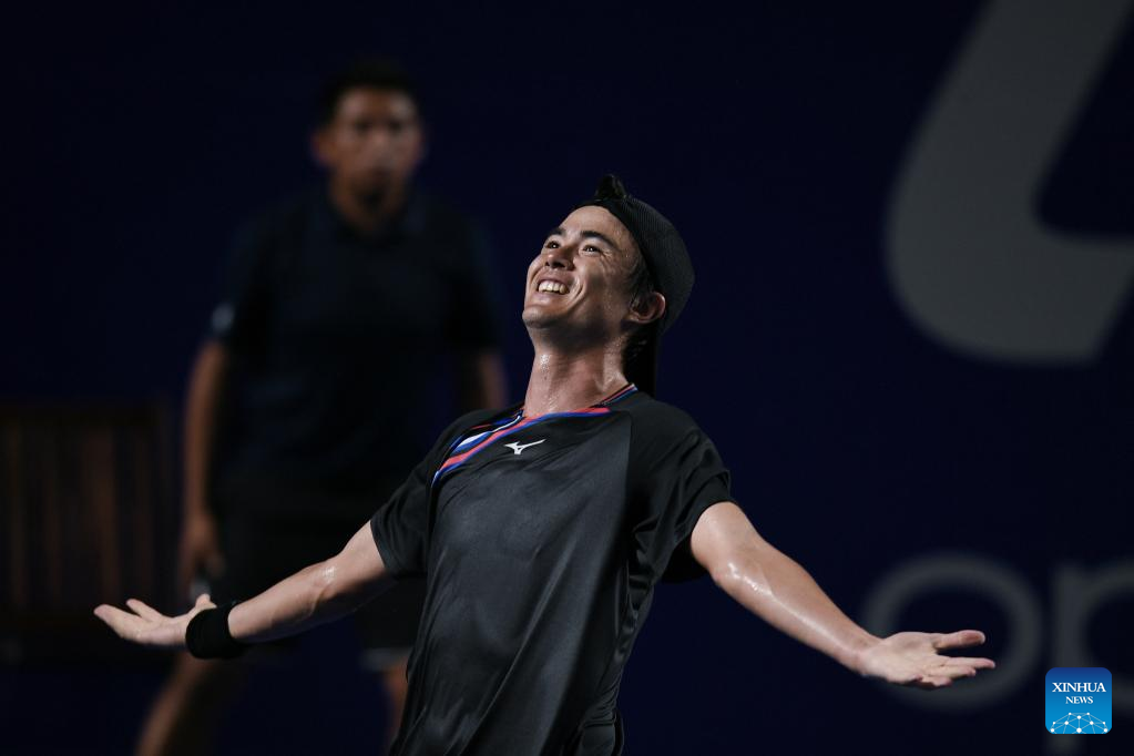 Daniel Taro of Japan celebrates during the men's singles second round match against Casper Ruud of Norway at the 2023 ATP Mexican Open tennis tournament in Acapulco, Mexico, March 1, 2023. (Xinhua/Xin Yuewei)
