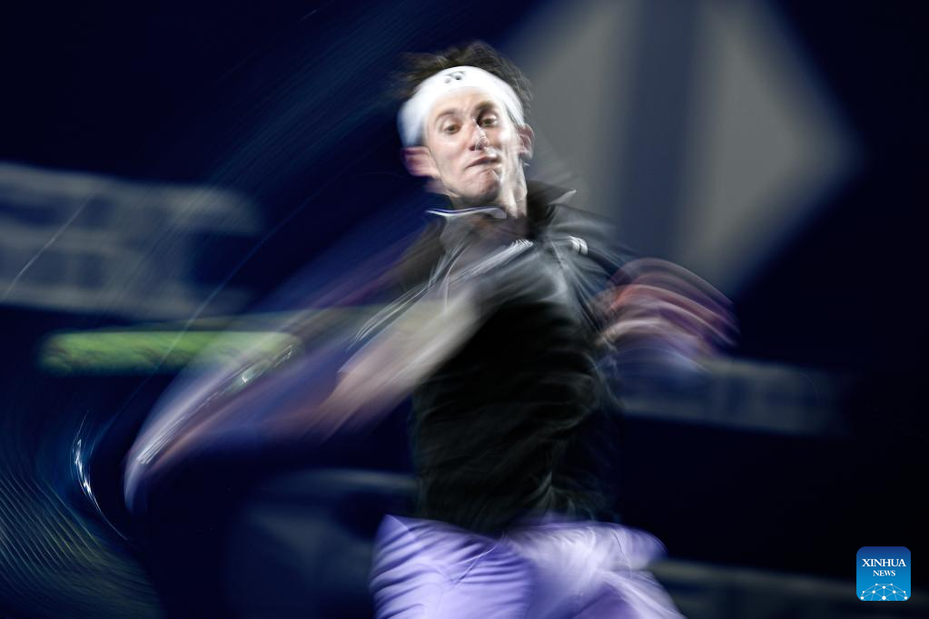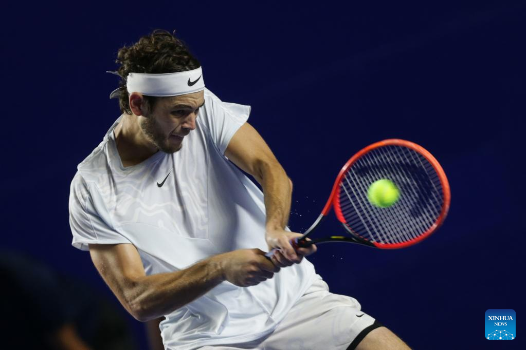 Taylor Fritz of the United States hits a return during the men's singles second round match against Denis Shapovalov of Canada at the 2023 ATP Mexican Open tennis tournament in Acapulco, Mexico, March 1, 2023. (Photo by Francisco Canedo/Xinhua)