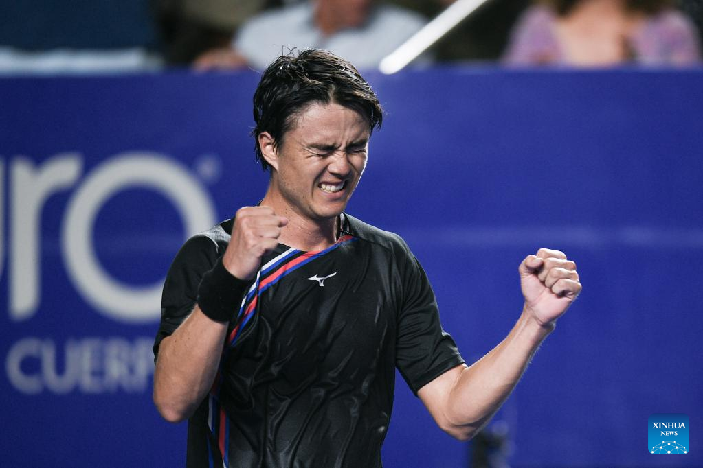 Daniel Taro of Japan celebrates after winning the men's singles second round match against Casper Ruud of Norway at the 2023 ATP Mexican Open tennis tournament in Acapulco, Mexico, March 1, 2023. (Xinhua/Xin Yuewei)