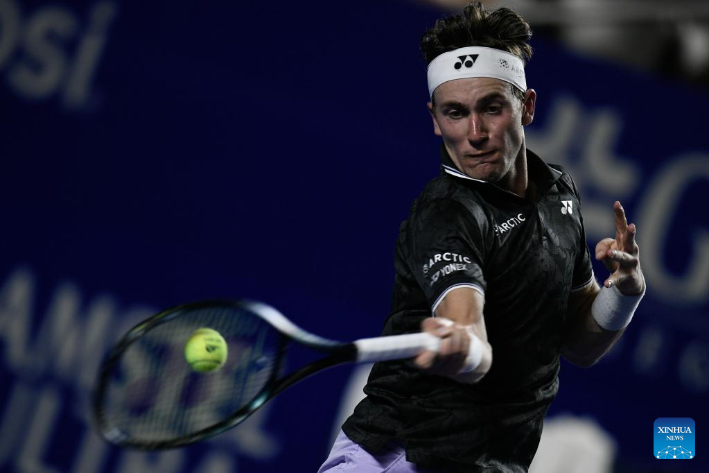 Casper Ruud of Norway hits a return during the men's singles second round match against Daniel Taro of Japan at the 2023 ATP Mexican Open tennis tournament in Acapulco, Mexico, March 1, 2023. (Xinhua/Xin Yuewei)